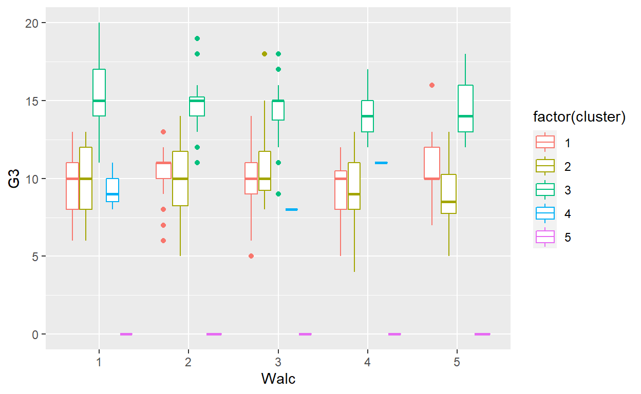 ggplot(GP_Math, aes(x=Walc, y = G3, color = factor(cluster))) + geom_boxplot()